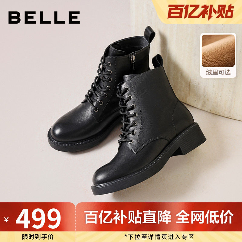 百丽女靴英伦风真皮马丁靴女保暖冬新时装靴厚底加绒短靴B9T1DDD4