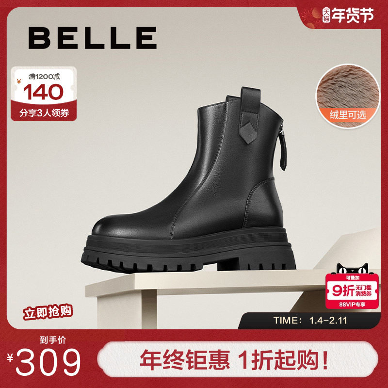 百丽女靴子英伦风马丁靴冬季新款真皮显瘦加绒厚底短靴E8M2DDZ5