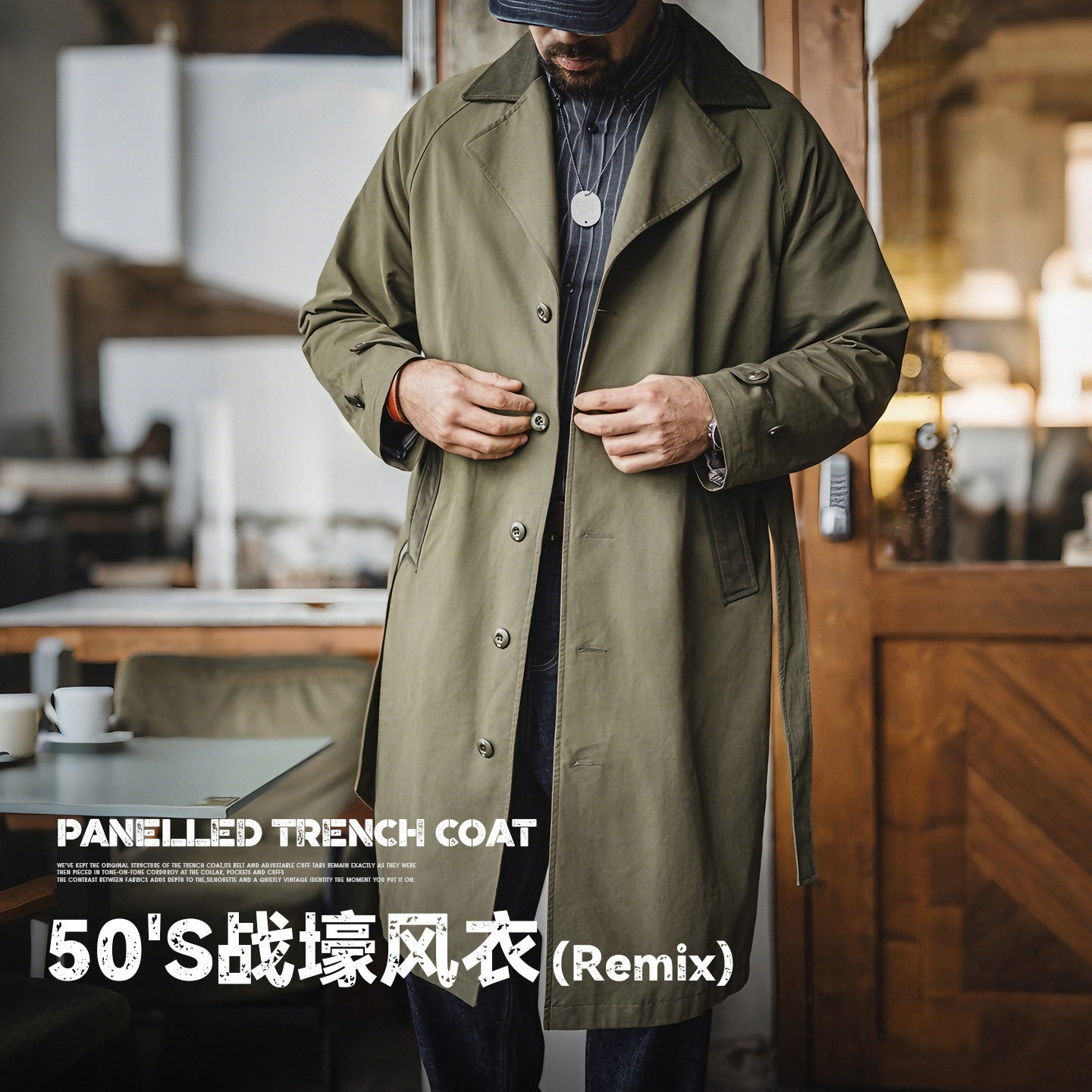 马登工装美式复古战壕风衣军绿色中长款翻领纯棉大衣外套男款春季