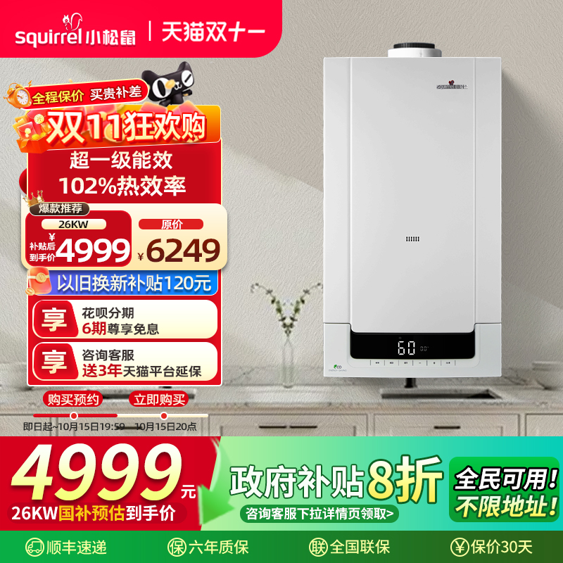 【一级冷凝】小松鼠燃气壁挂炉天然气家用暖气片采暖地暖炉Q7PLUS