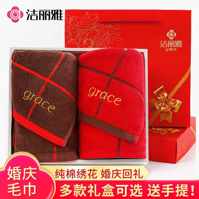 洁丽雅喜庆毛巾纯棉两条装组合礼盒团购可定制logo刺绣结婚礼品