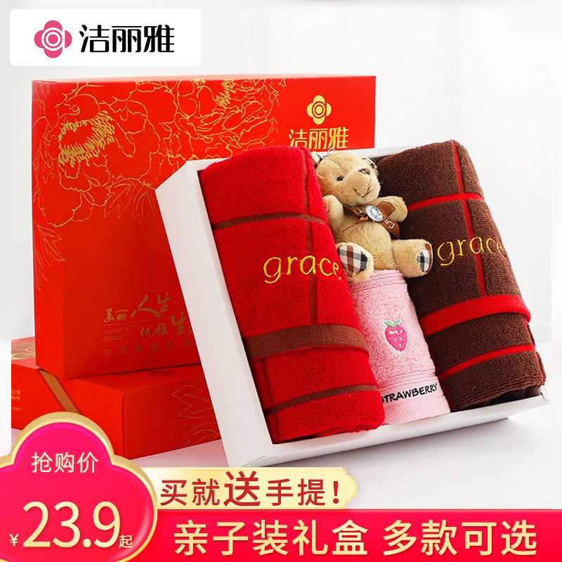 洁丽雅毛巾礼盒套装纯棉情侣亲子装2大1小家用毛巾定制logo团购