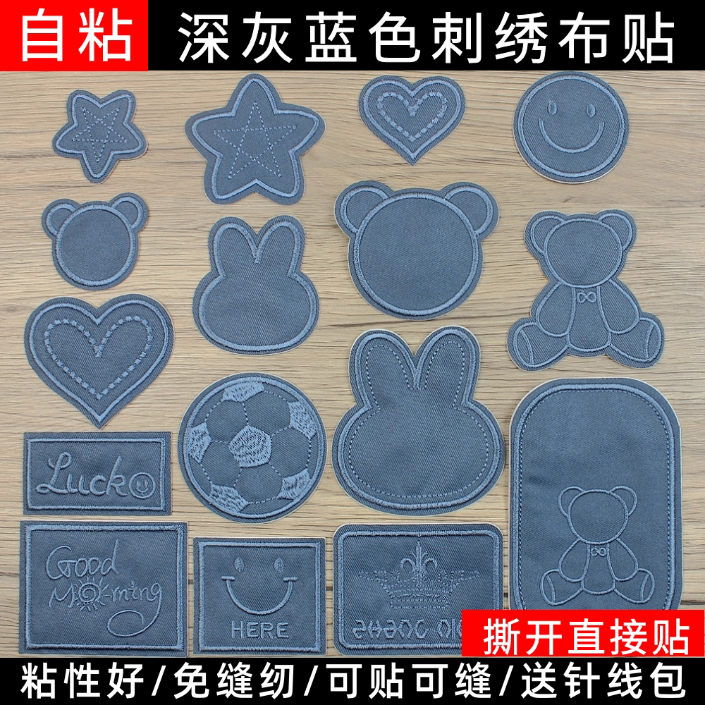 深灰蓝色牛仔衣裤羽绒服布料自粘破洞修补贴科技布沙发刺绣补丁贴