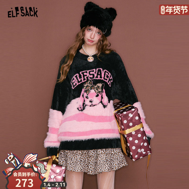 妖精的口袋毛绒绒小狗粉色撞色毛衣女2025冬新款甜美可爱新年穿搭
