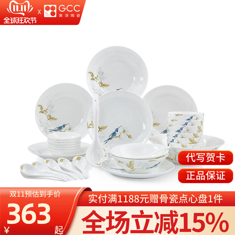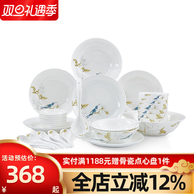 高淳陶瓷绿之灵新中式骨瓷餐具套装家用碗碟盘子碟碗高档餐具套装