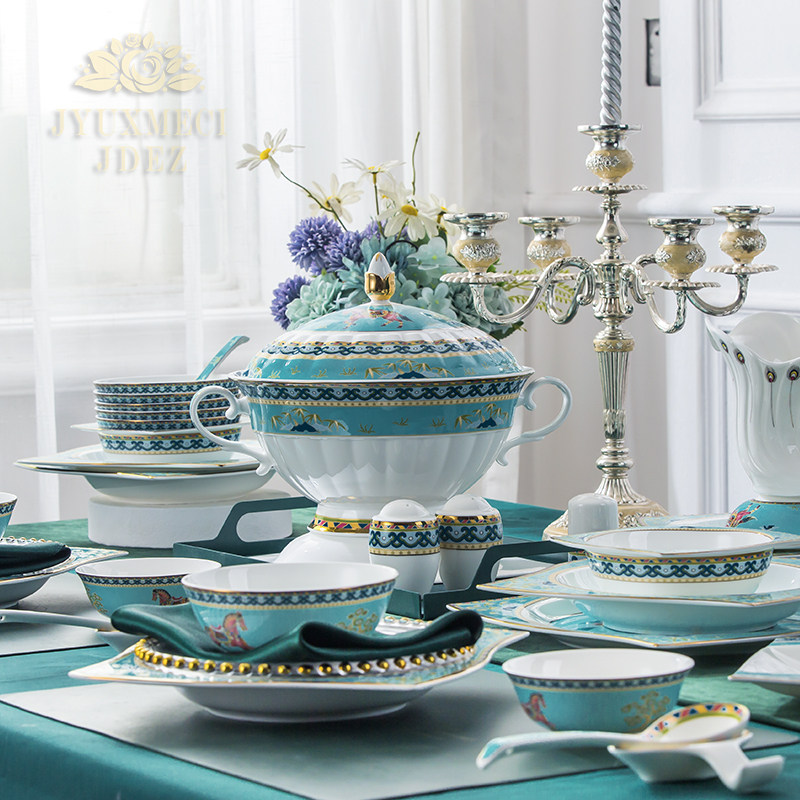 欧式高档餐具套装 景德镇碗盘碟组合 豪华爱马方形盘子 家用骨瓷