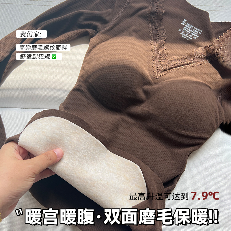 7A羊绒保暖内衣女免穿文胸内搭外穿打底衫蕾丝加绒加厚秋衣裤套装