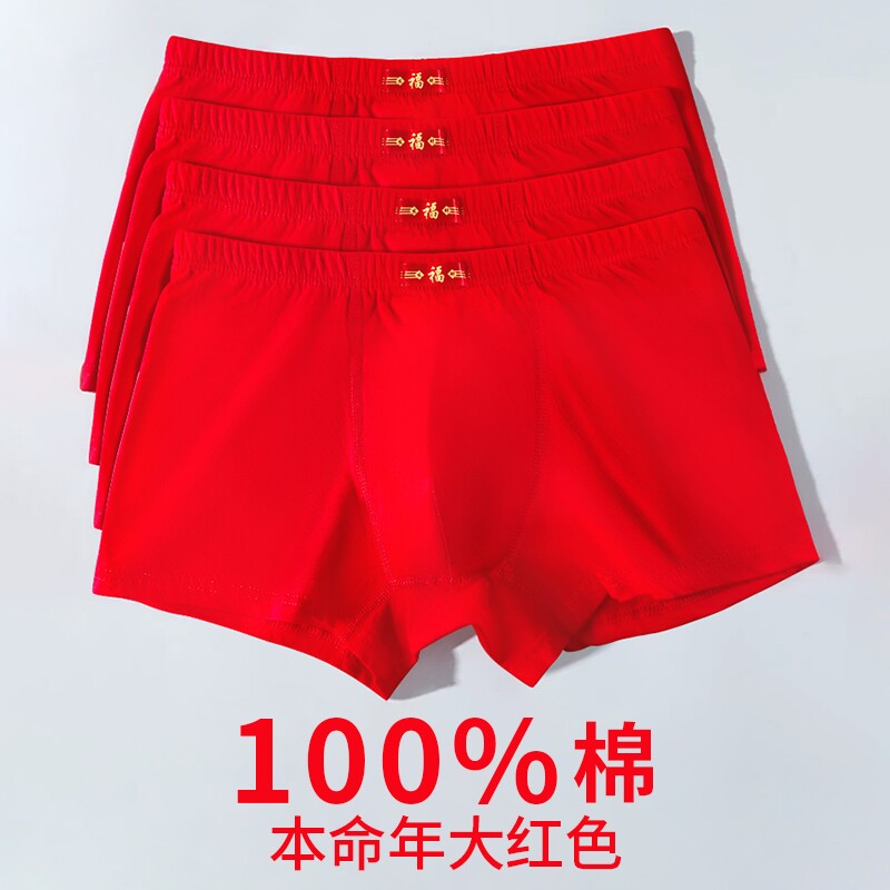 本命年红色内裤男士抗菌纯棉裆男生四角平角男款结婚马年新年短裤