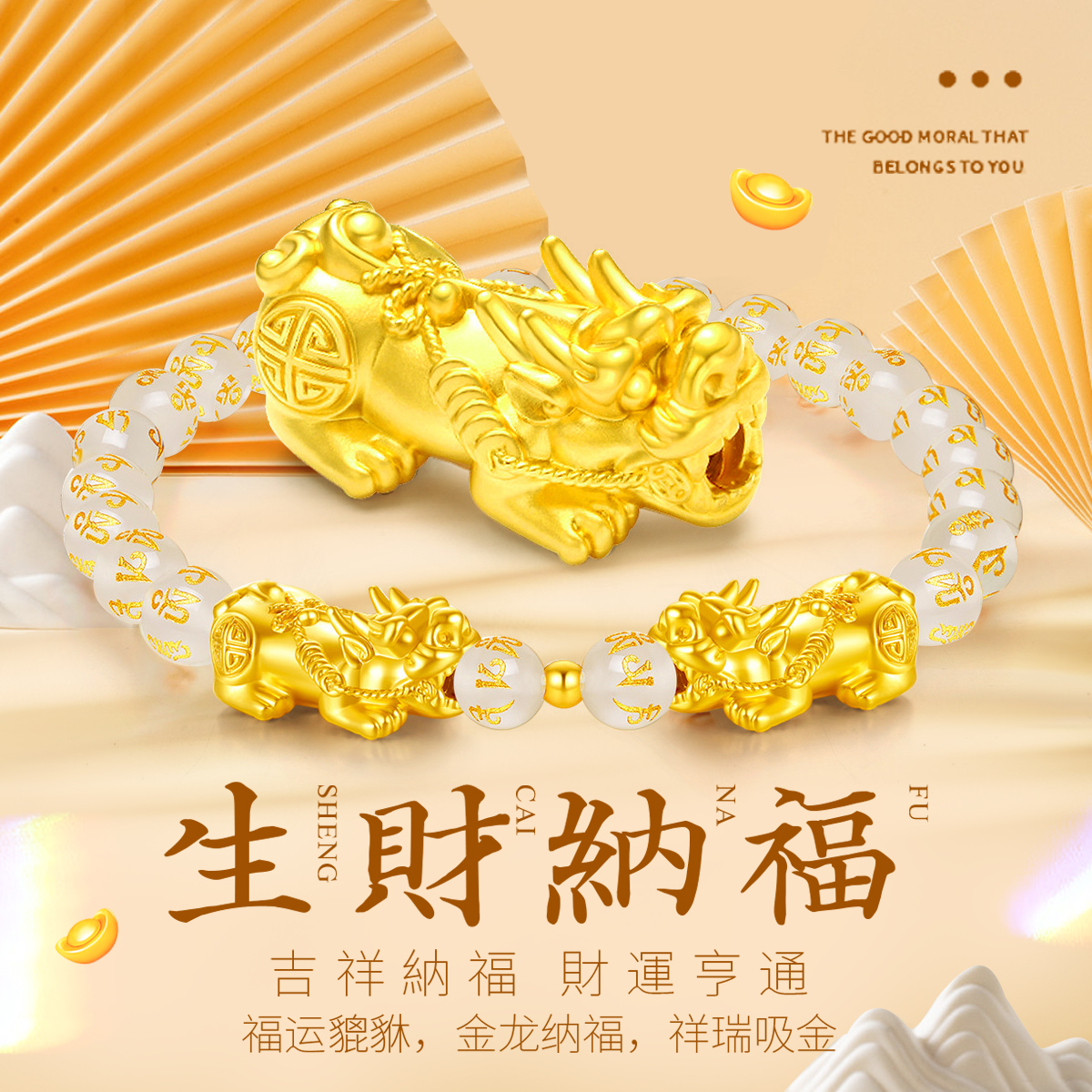 梦金园貔貅黄金手链男女一对情侣款5D万纯足金转运珠手绳节日礼物