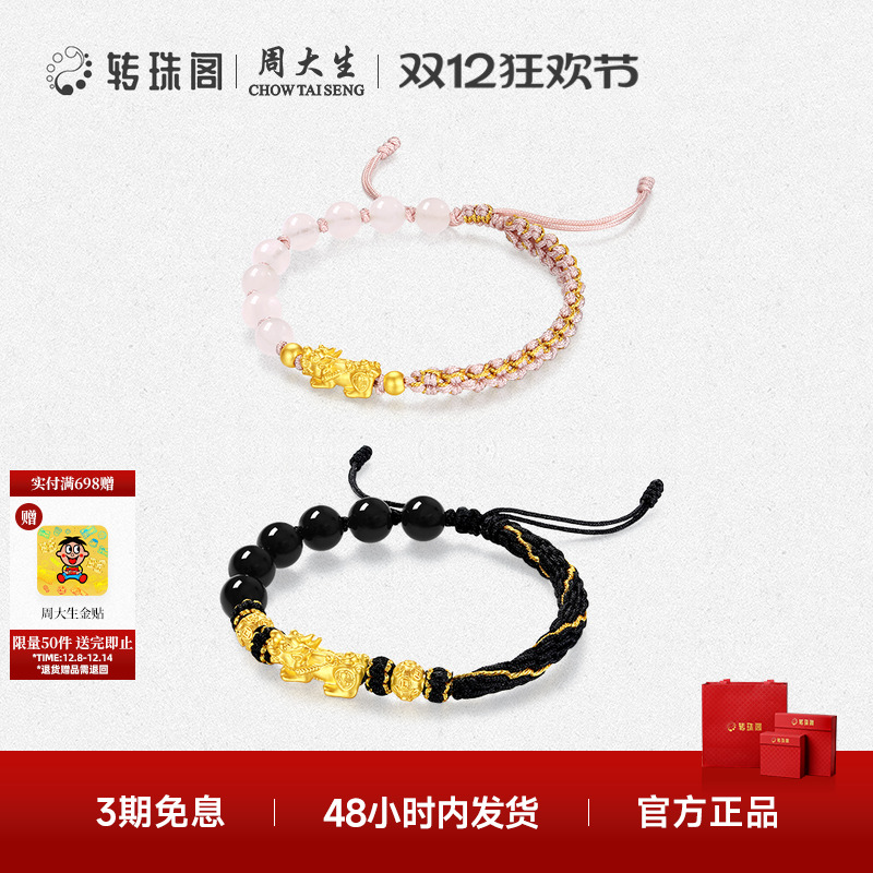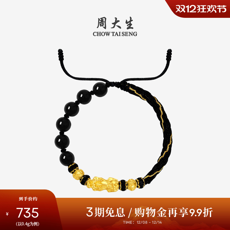 周大生黄金貔貅手链男款转运珠金珠黑曜石男士手串送男友圣诞礼物