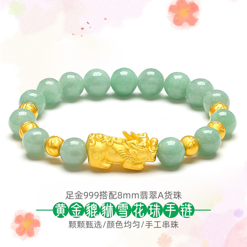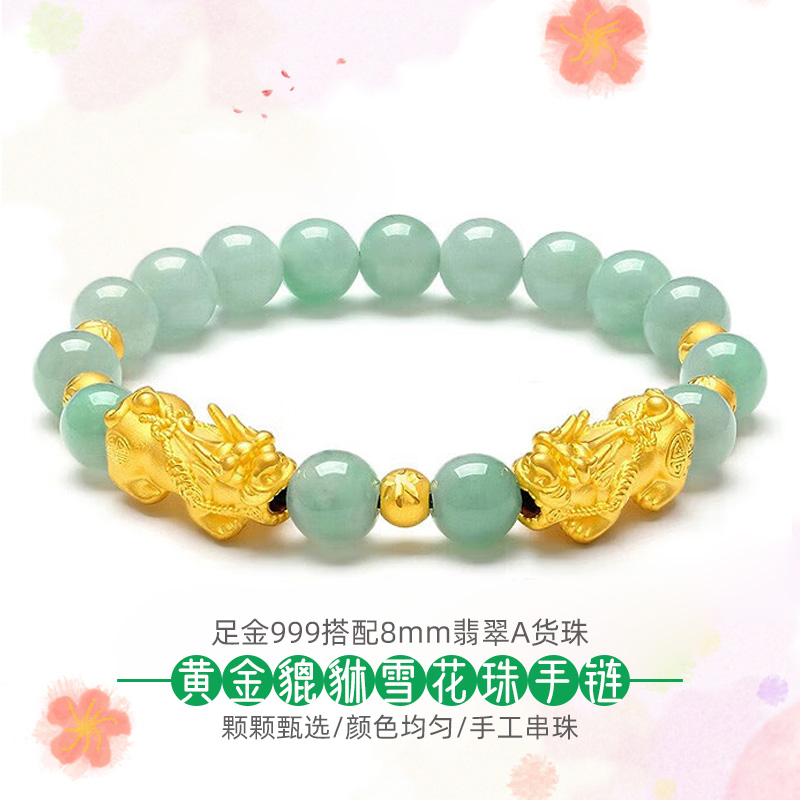 黄金貔貅手链女 足金999双貔貅雪花转运珠翡翠玉珠手串送女友妈妈