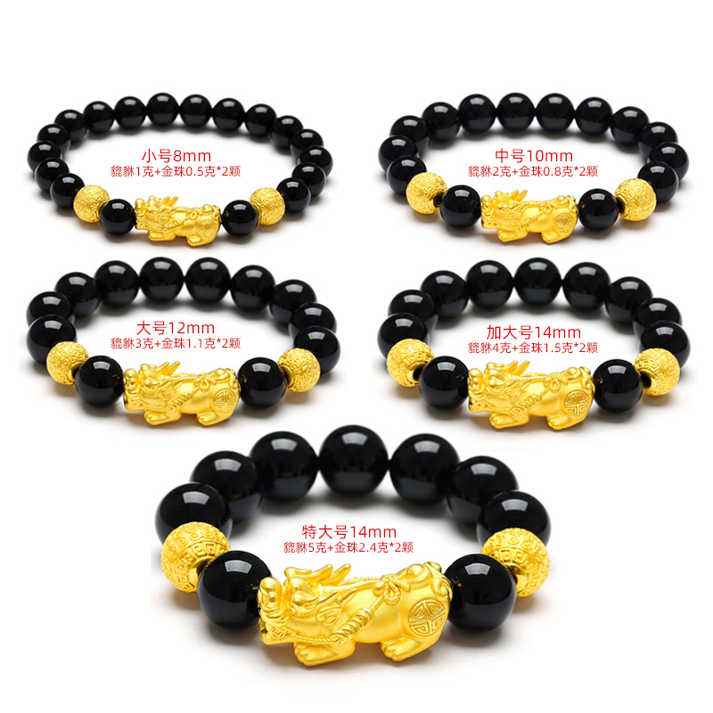 黄金貔貅手链男保平安金色好运珠手链情侣款黑曜石招财金手串平安