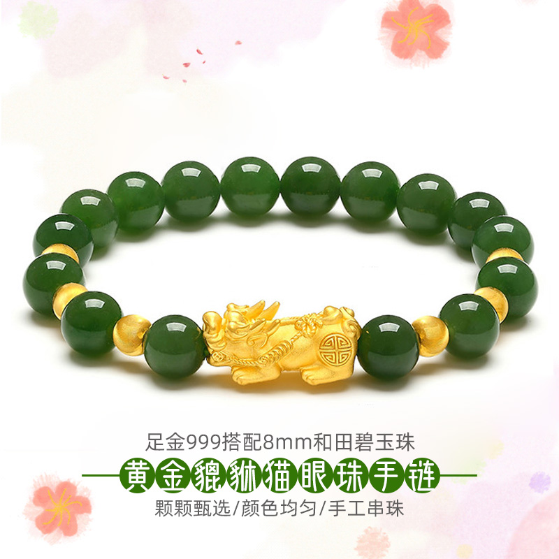 黄金貔貅手链女 999足金猫眼珠手串8mm天然和田碧玉双貔貅手串
