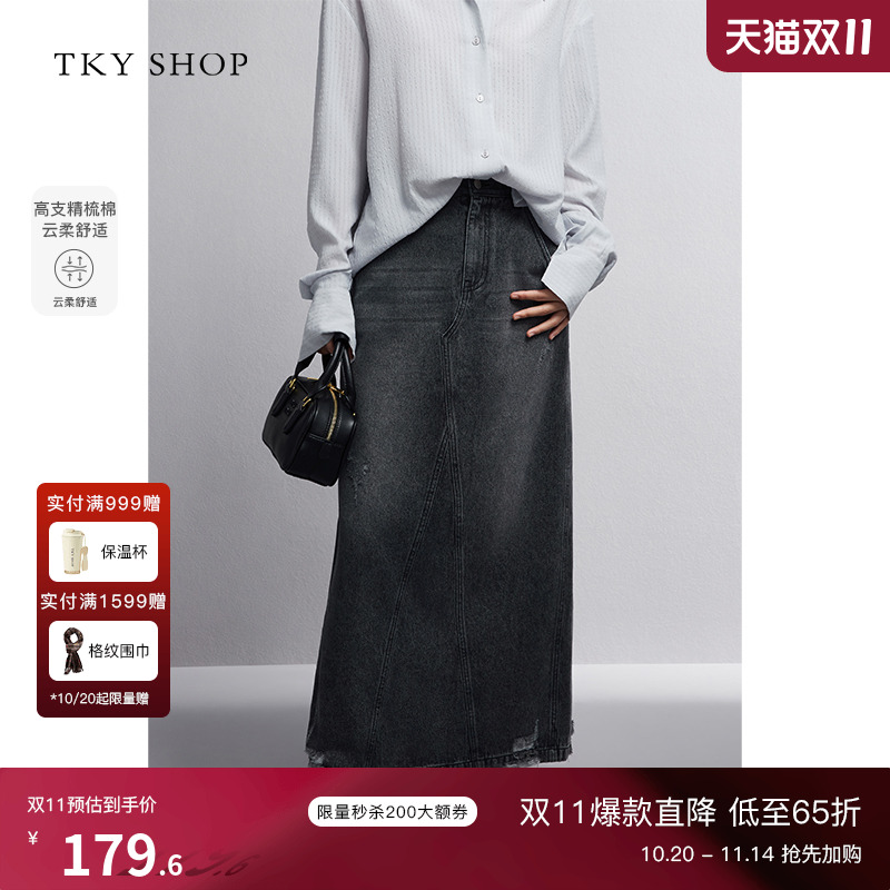 TKY SHOP美式复古牛仔裙2025秋新款不规则毛边半身裙高腰开叉裙子
