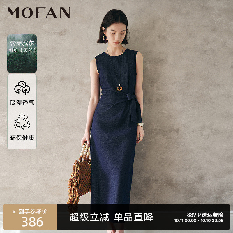 莱赛尔无袖牛仔裙MOFAN摩凡2025夏款侧边系带可调腰身显瘦连衣裙