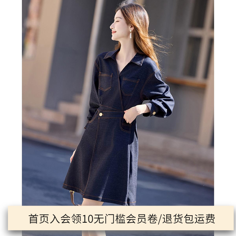 鸟系!高级感牛仔裙2025秋季新款工装时尚长裙翻领收腰长袖连衣裙
