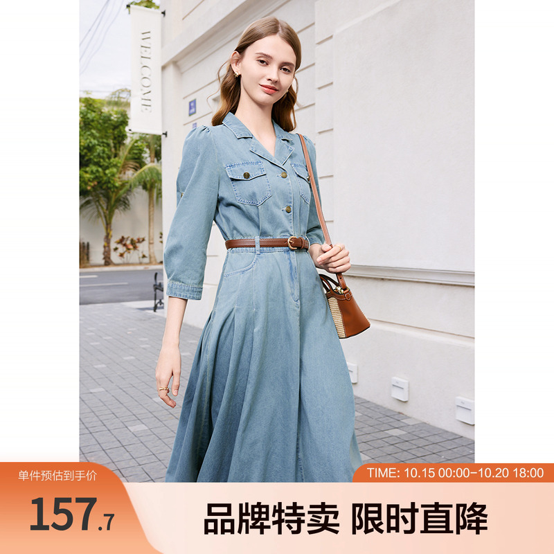 白鹿语立体小翻领牛仔裙2025春季新款复古纽扣收腰鱼尾裙摆连衣裙