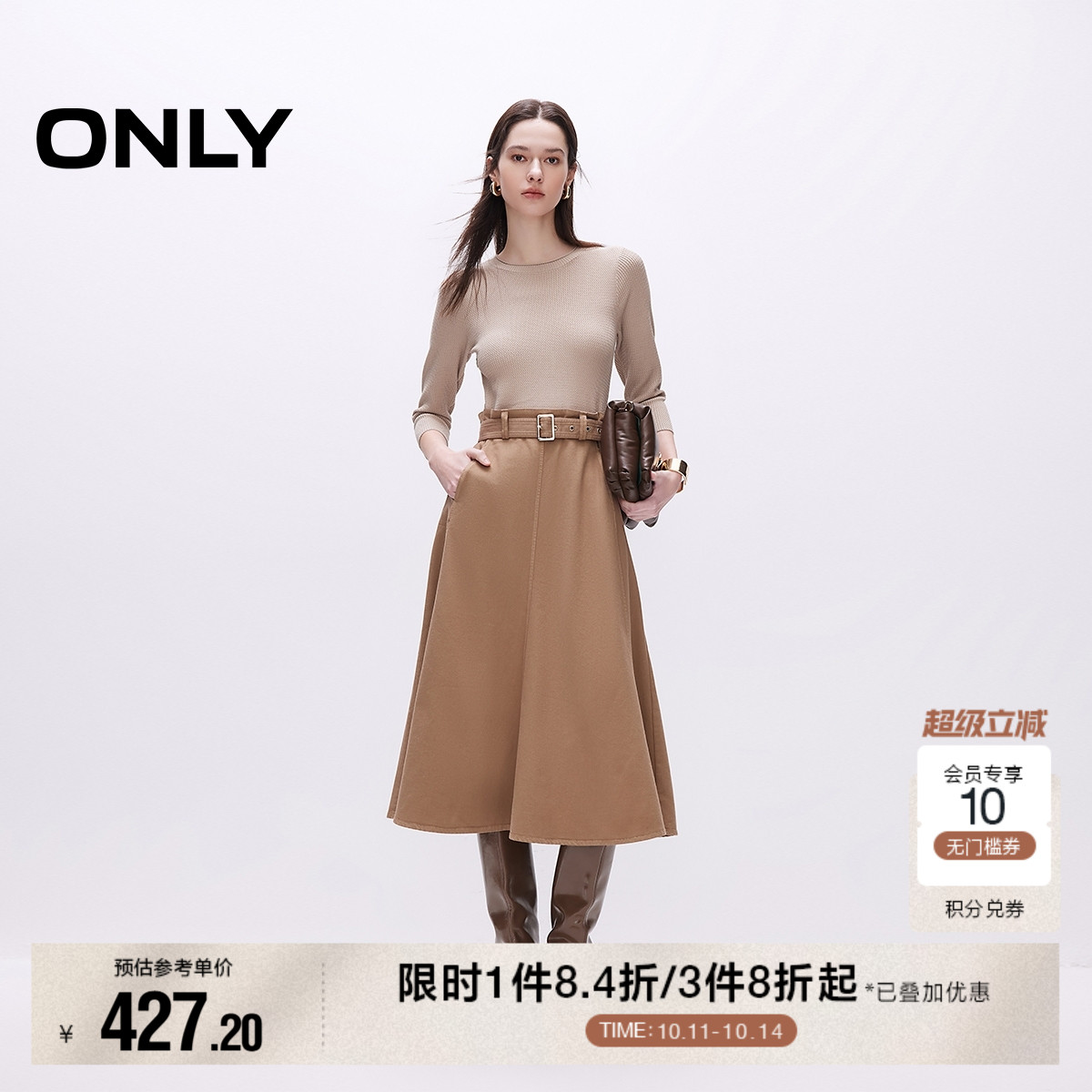 ONLY奥莱2025秋季新款修身针织拼接牛仔裙圆领高腰七分袖连衣裙女