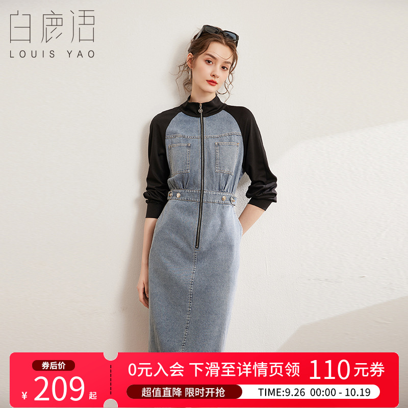 白鹿语时髦针织拼接牛仔裙25秋新款复古拉链立领长袖中长连衣裙
