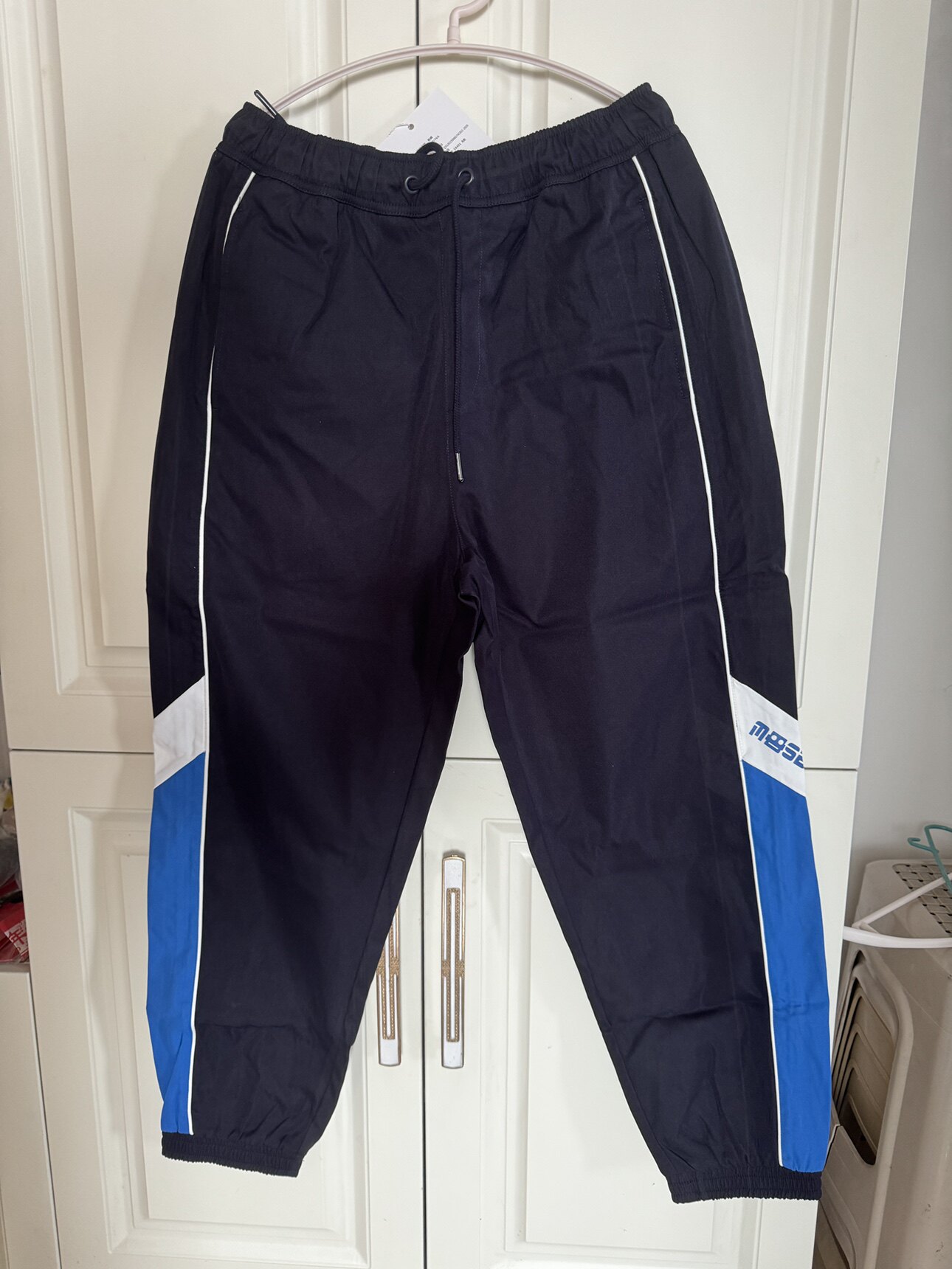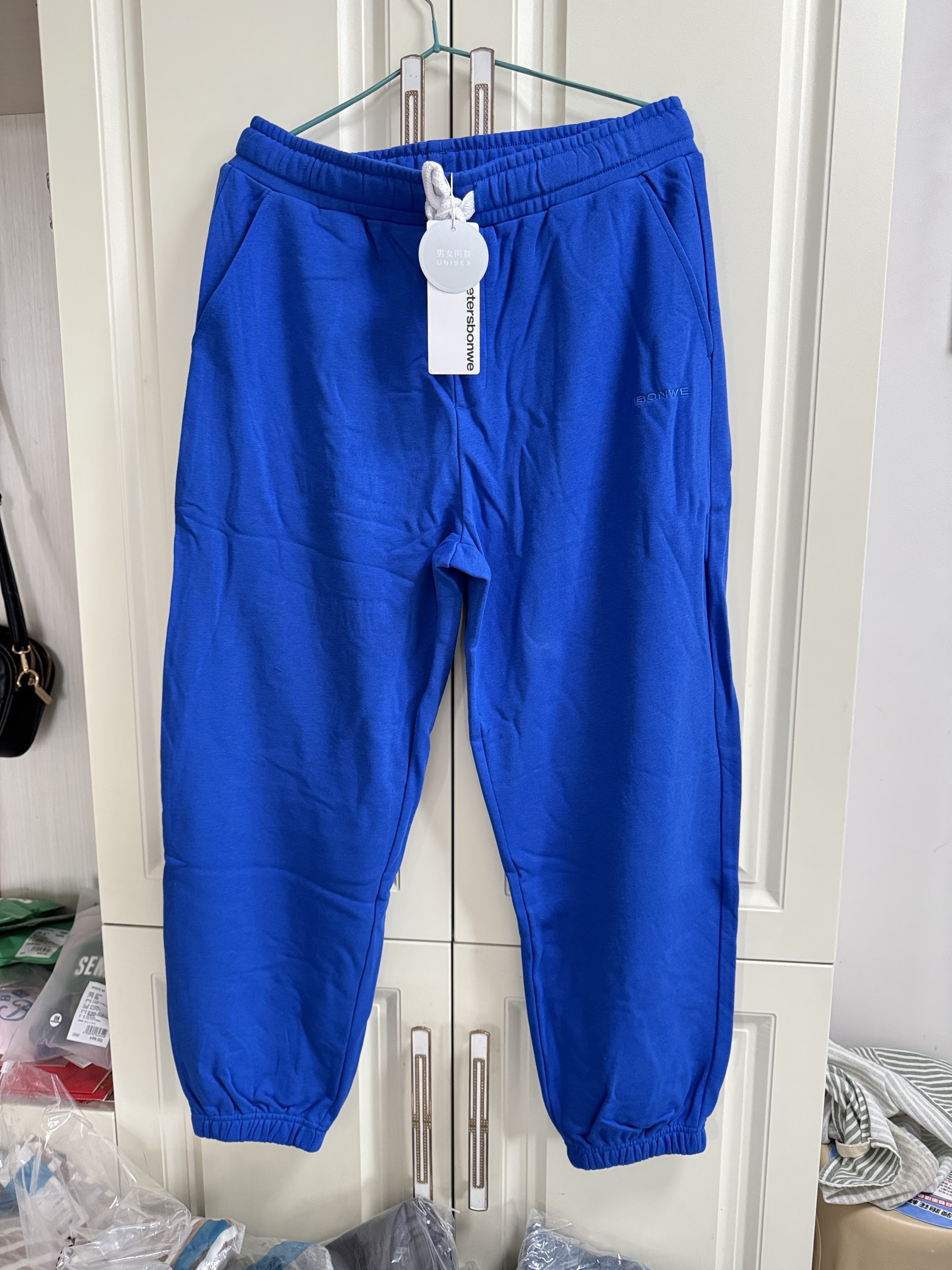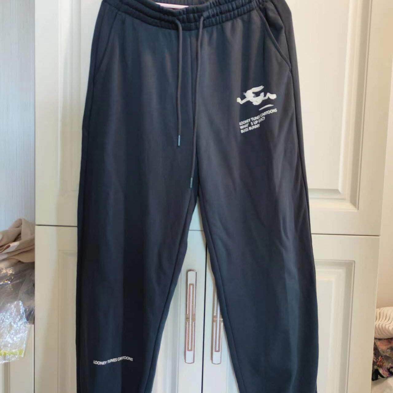 国货美特斯男女同款针织裤舒适春秋宽松蓝色束脚运动长裤纯色卫裤