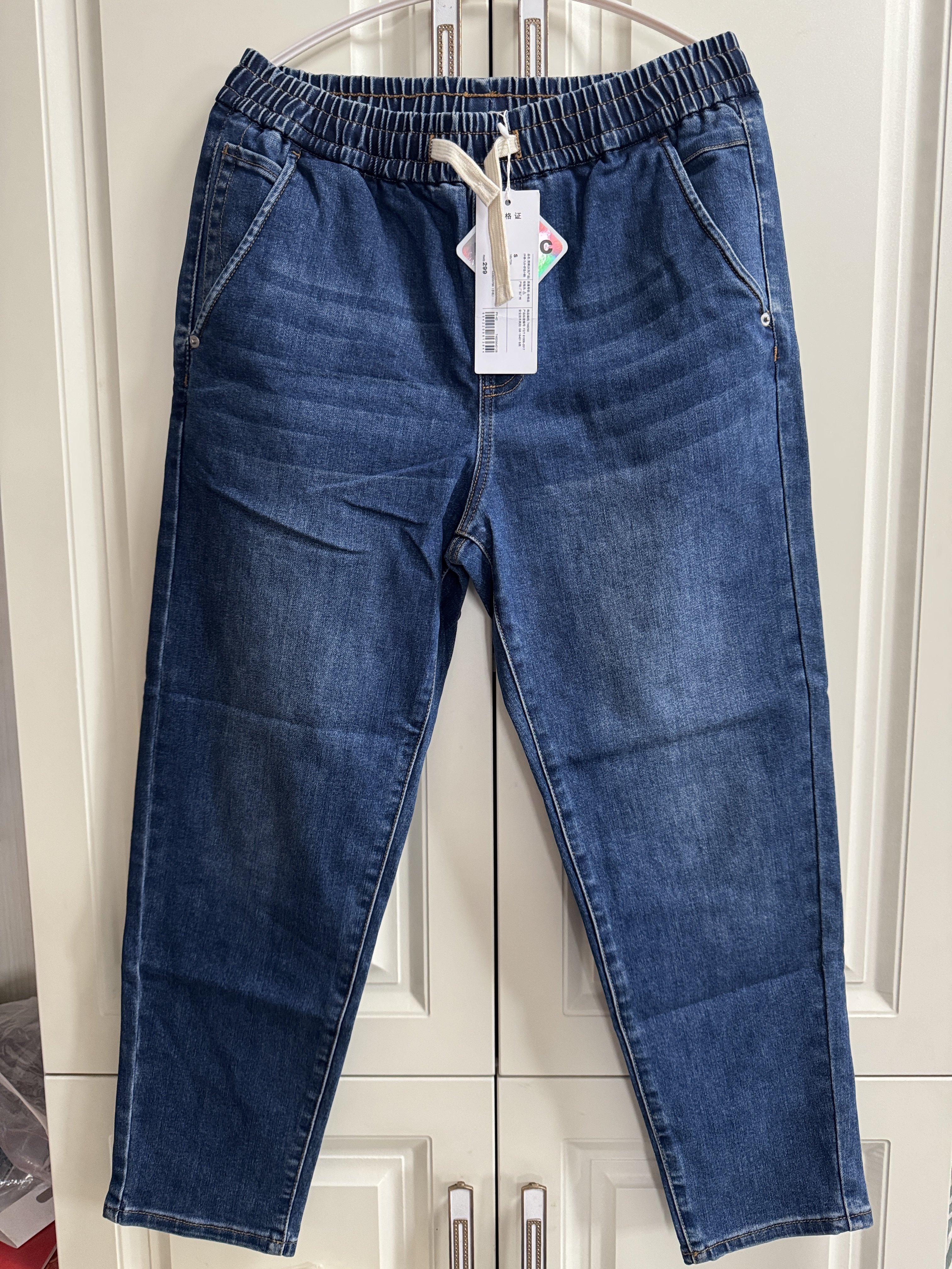美特斯男牛仔裤春秋季宽松舒适弹力牛仔休闲裤腰绳松紧基础锥形裤