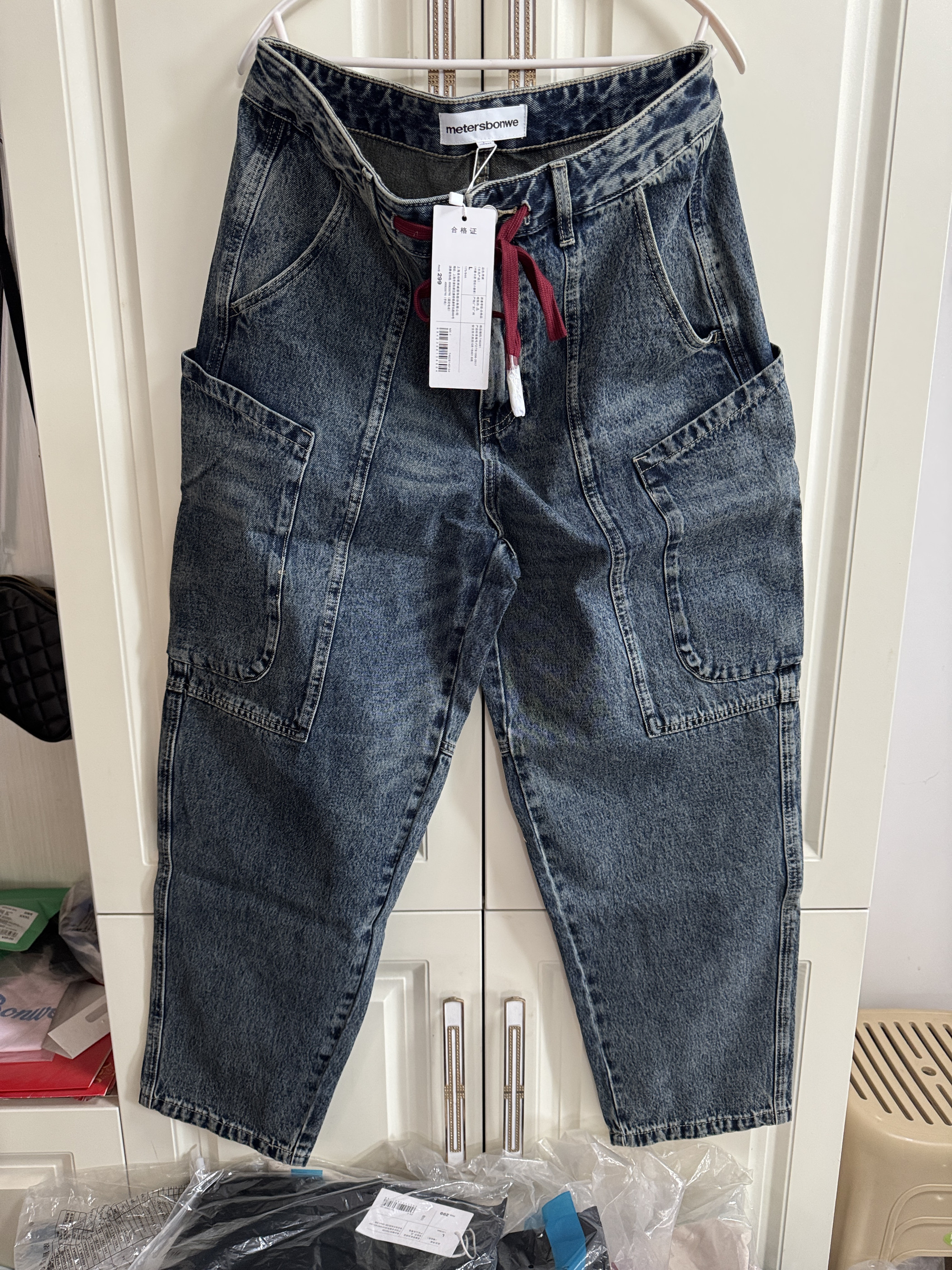 国货美特斯男牛仔裤子春秋新款设计大口袋个性时尚锥形系带休闲裤