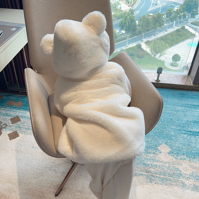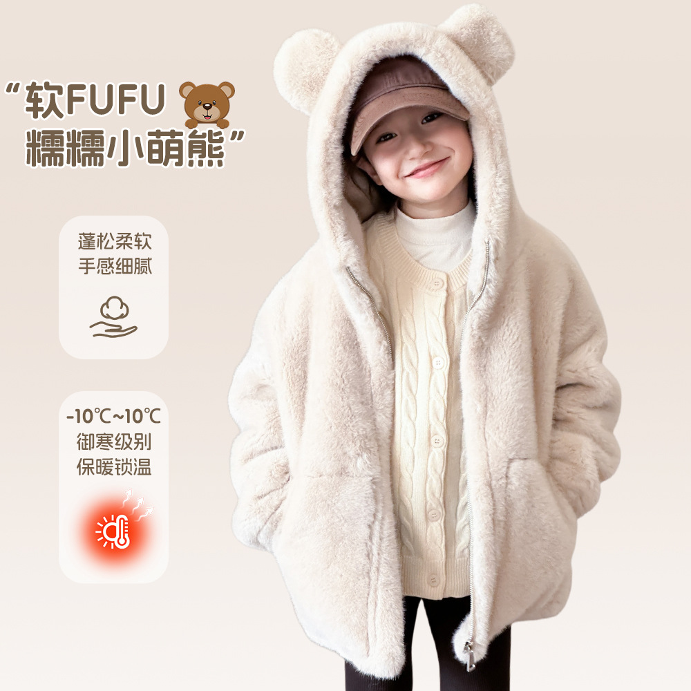女宝宝冬装加绒皮草外套儿童白色小熊连帽毛毛棉衣加厚保暖中长款