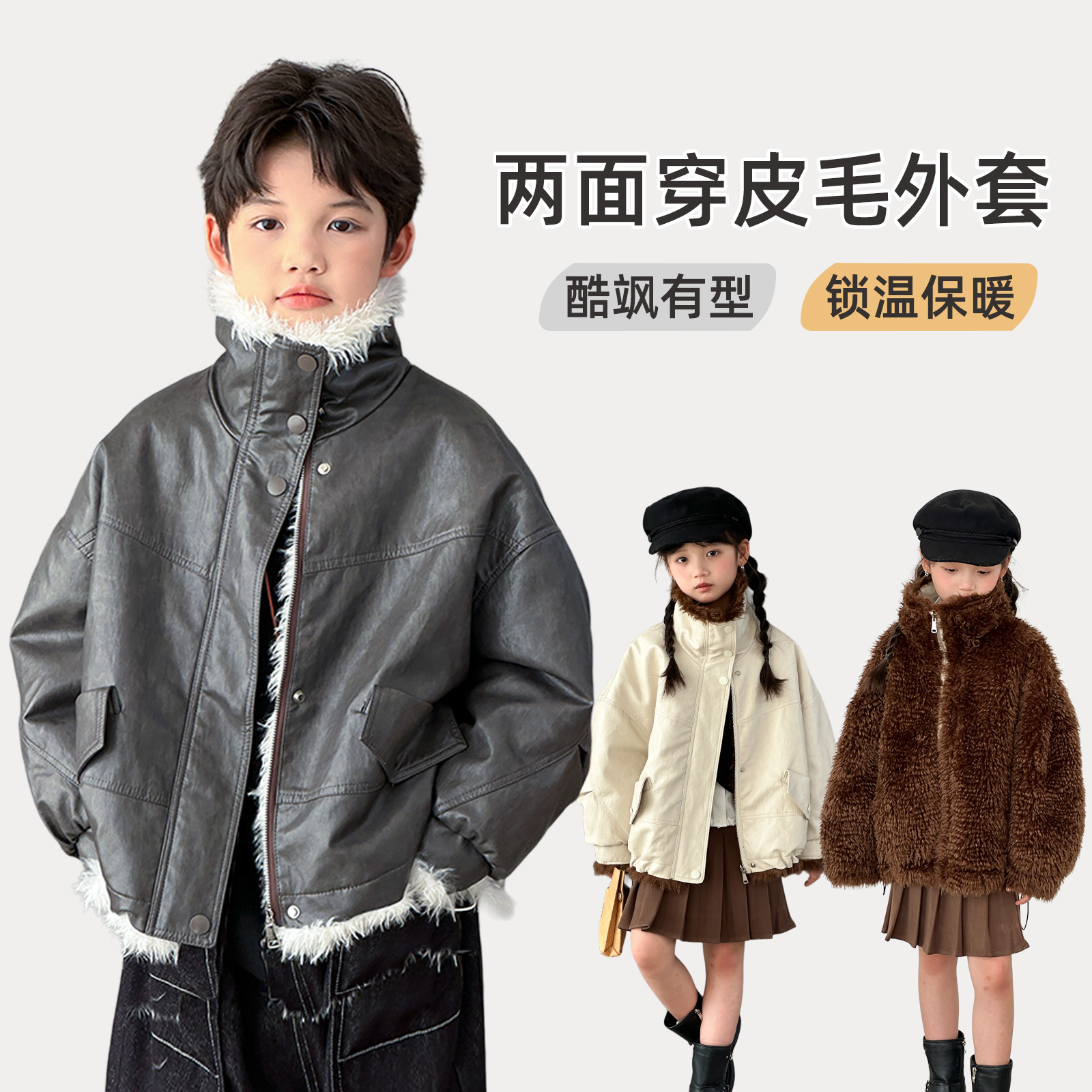 儿童外套2025冬季皮衣夹克中大童加厚宝宝皮草机车服男童女童外套