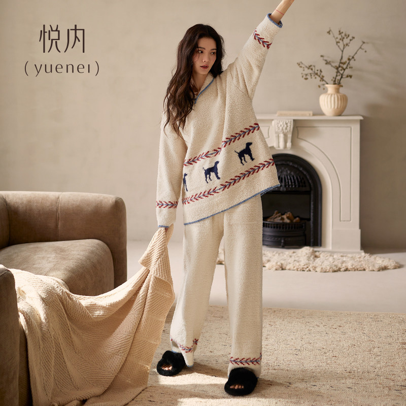 悦内半边绒睡衣女款秋冬季珊瑚绒家居服复古费尔岛可外穿保暖套装