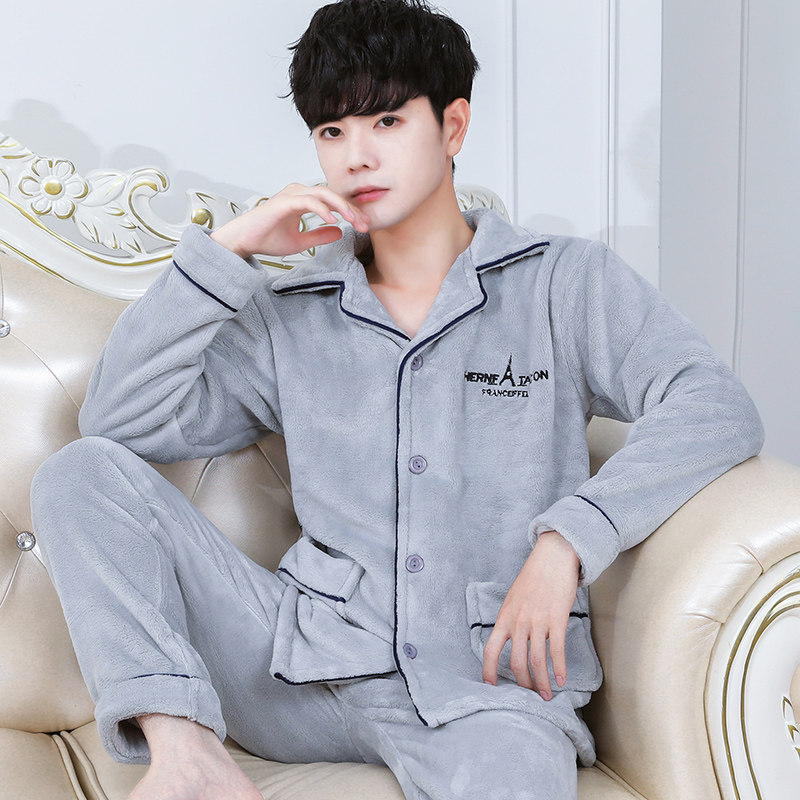 秋冬季珊瑚绒睡衣男士加厚加绒法兰绒保暖翻领大码青年家居服套装