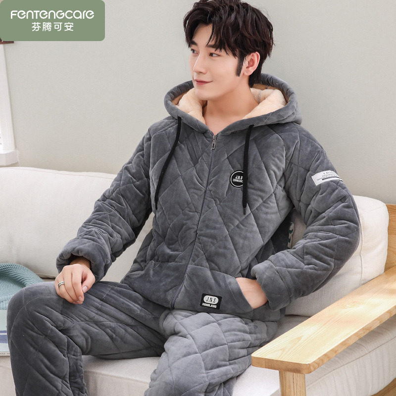 芬腾可睡衣男士加厚加绒三层夹棉大码拉链连帽秋冬季珊瑚绒家居服