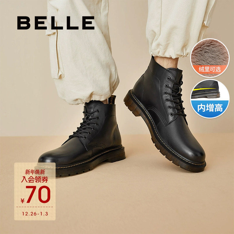 百丽男鞋冬季款真皮马丁靴男厚底增高黑色加绒保暖短靴子92267DD0