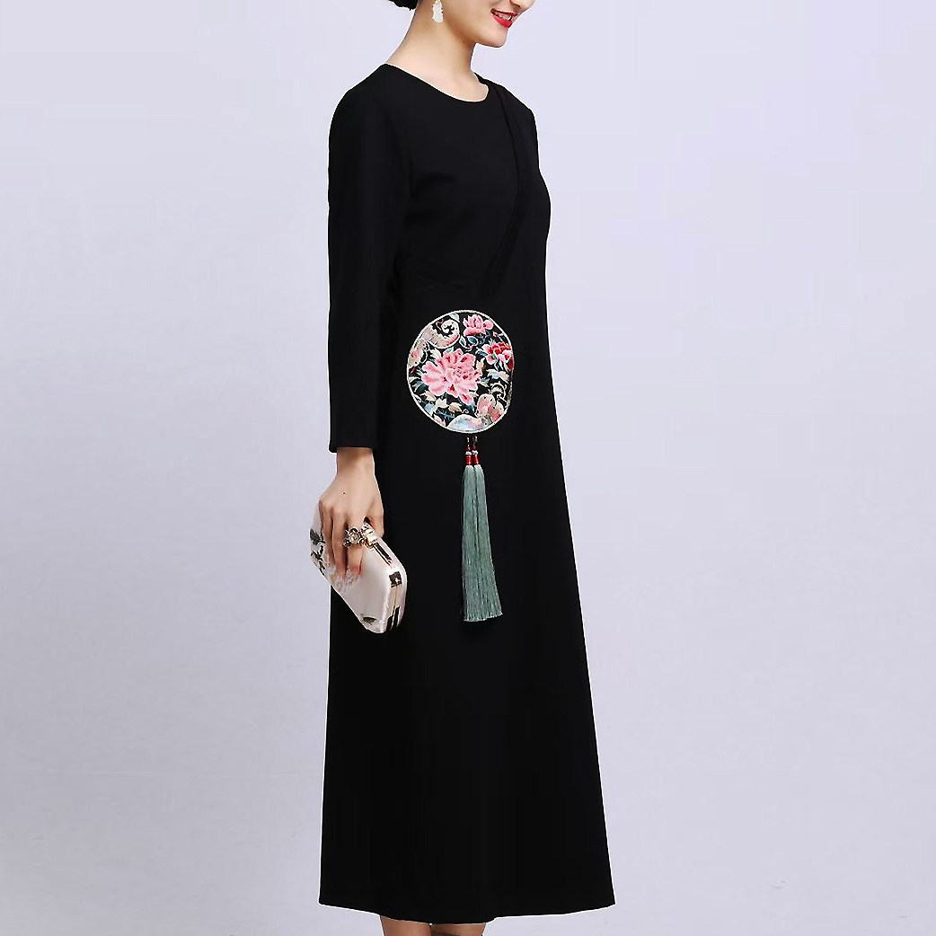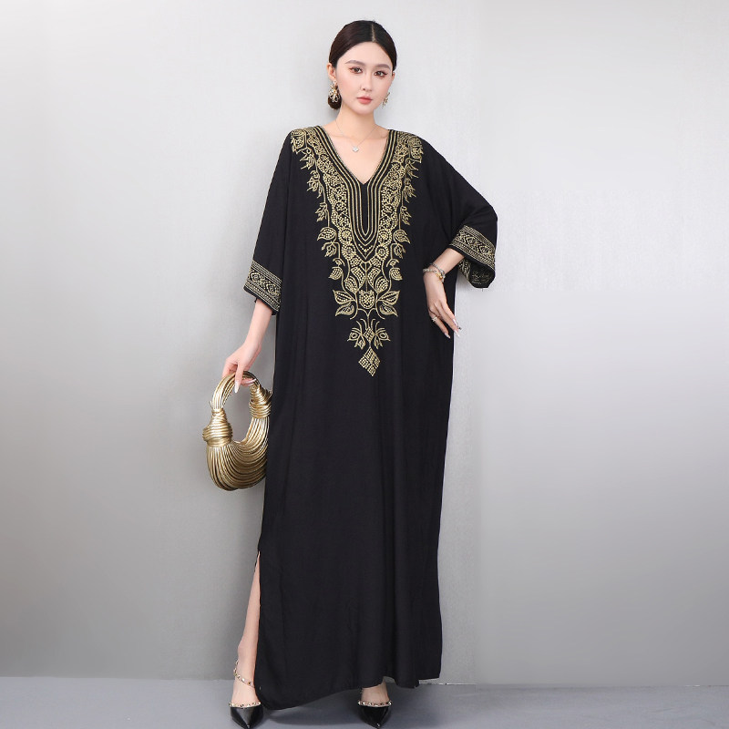 2026春季新款女刺绣连衣裙黑色V领民族风长裙显瘦度假裙大码宽松