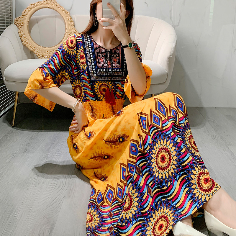 2025新款短袖高级感棉绸连衣裙夏天民族风长裙大摆三亚度假沙滩裙