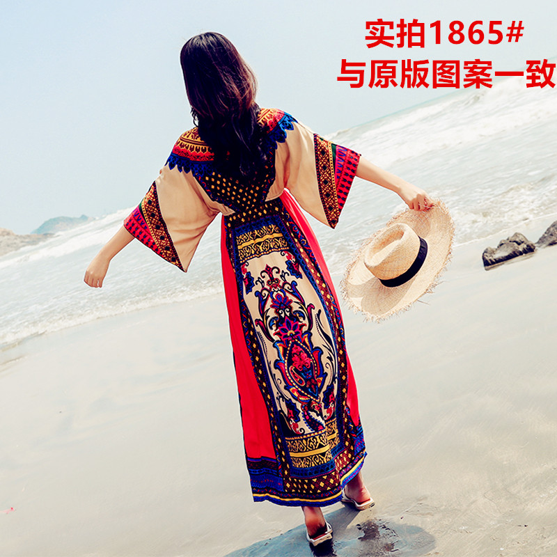 民族风波西米亚沙滩裙连衣裙长裙棉绸印花高腰海边度假碎花裙绵绸