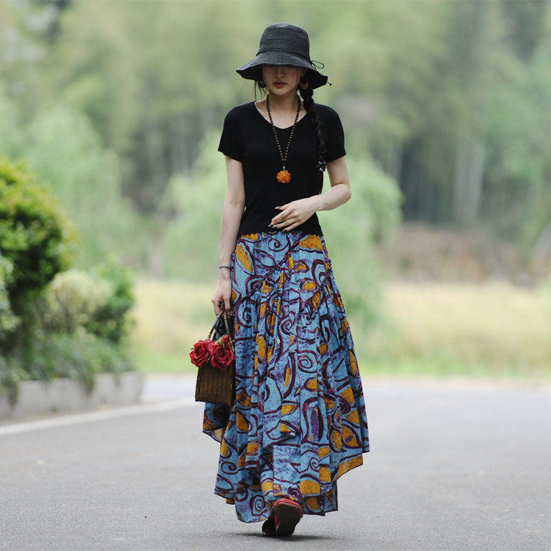 【水中歌】素心高腰显瘦民族风长裙女春秋复古印花棉麻大摆半身裙