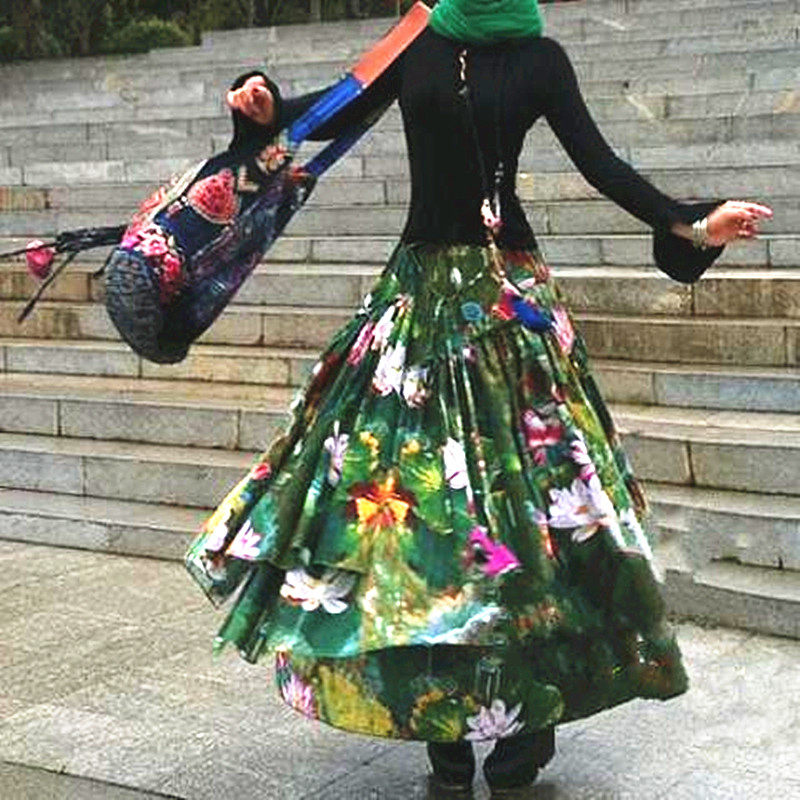 【紫玛】素心自制民族风长裙新款春秋印花府绸超大摆半身裙跳舞裙