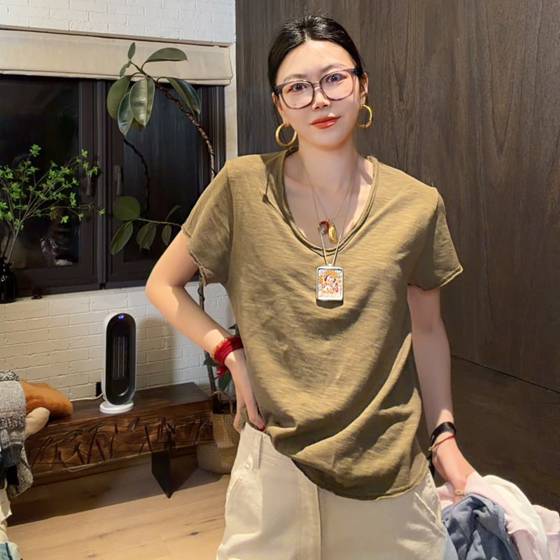 Yukiss 燕麦米色竹节棉V领短袖T恤女春韩系慵懒风宽松垂感打底衫