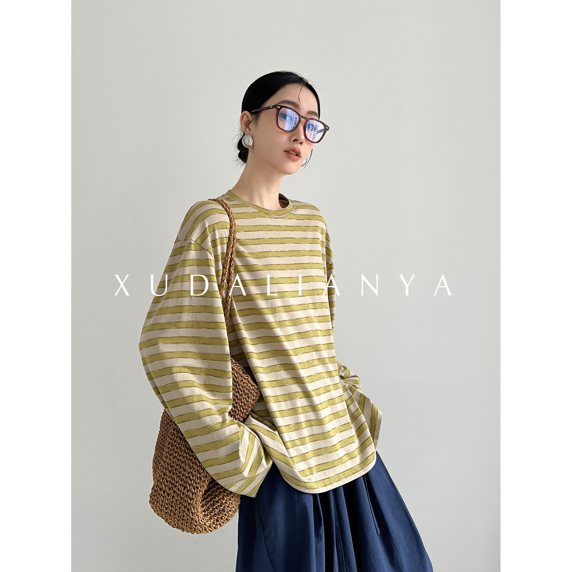 徐大脸吖定制 松弛慵懒感透气宽松长袖上衣春复古条纹防晒衫T恤女