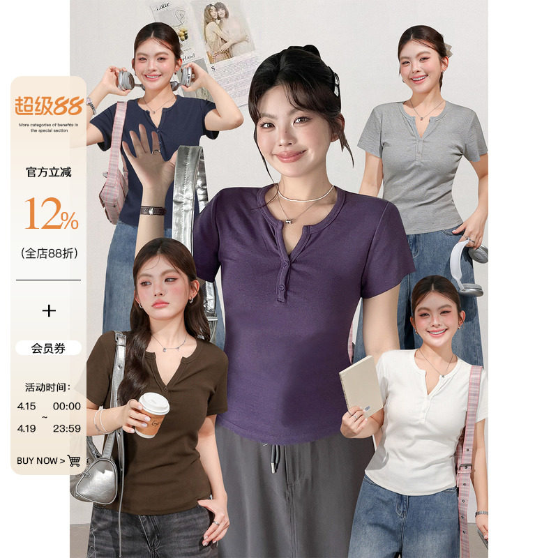 alex stevens舒适区 正肩V领短袖修身显瘦T恤女26夏季短款上衣