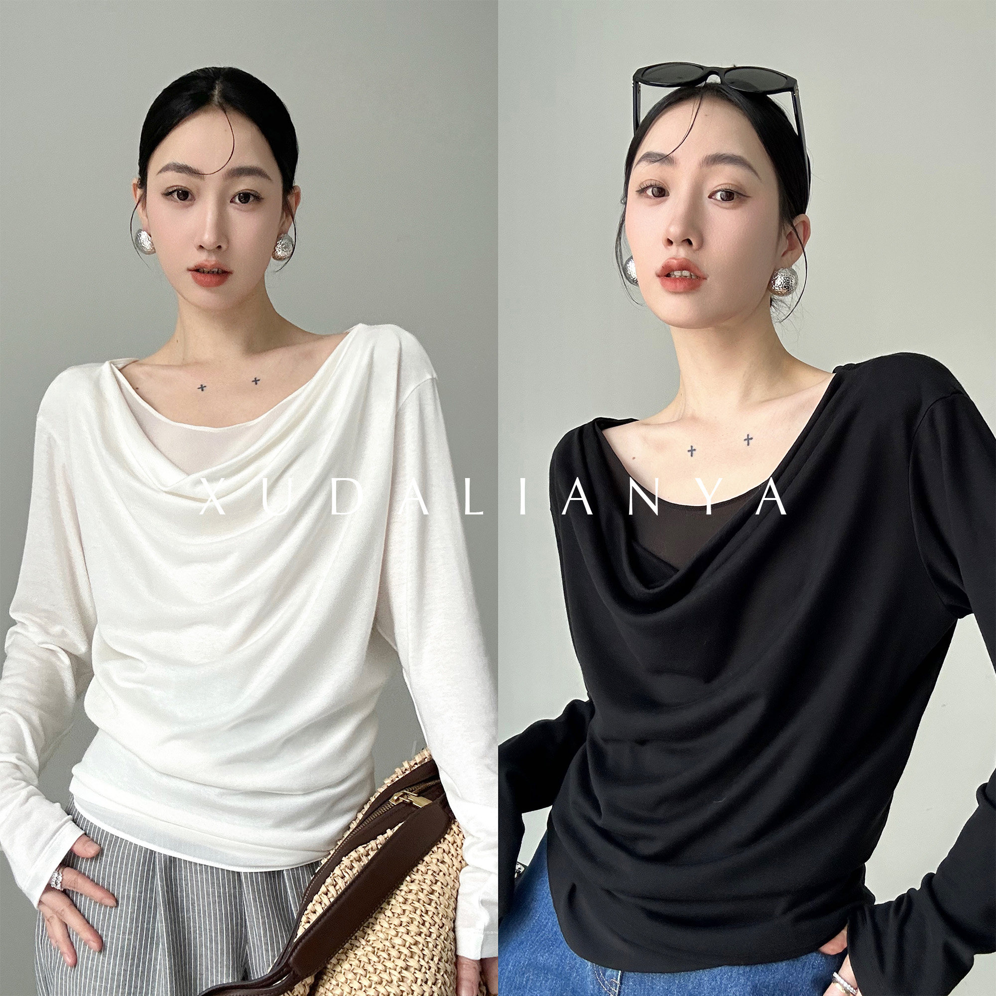 徐大脸吖定制 精致感荡领假两件上衣春气质天丝羊毛显瘦黑色T恤女