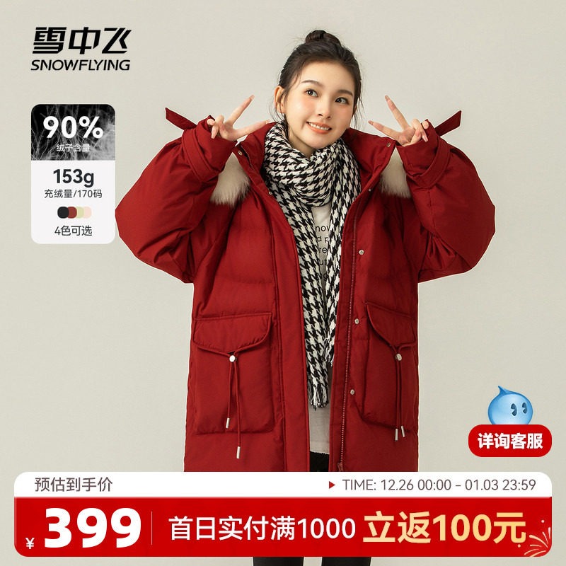 雪中飞2025秋冬新款韩版连帽大毛领狐狸毛红色百搭女外套羽绒服