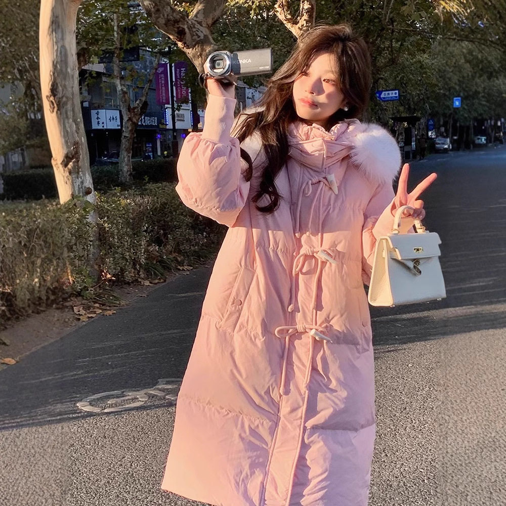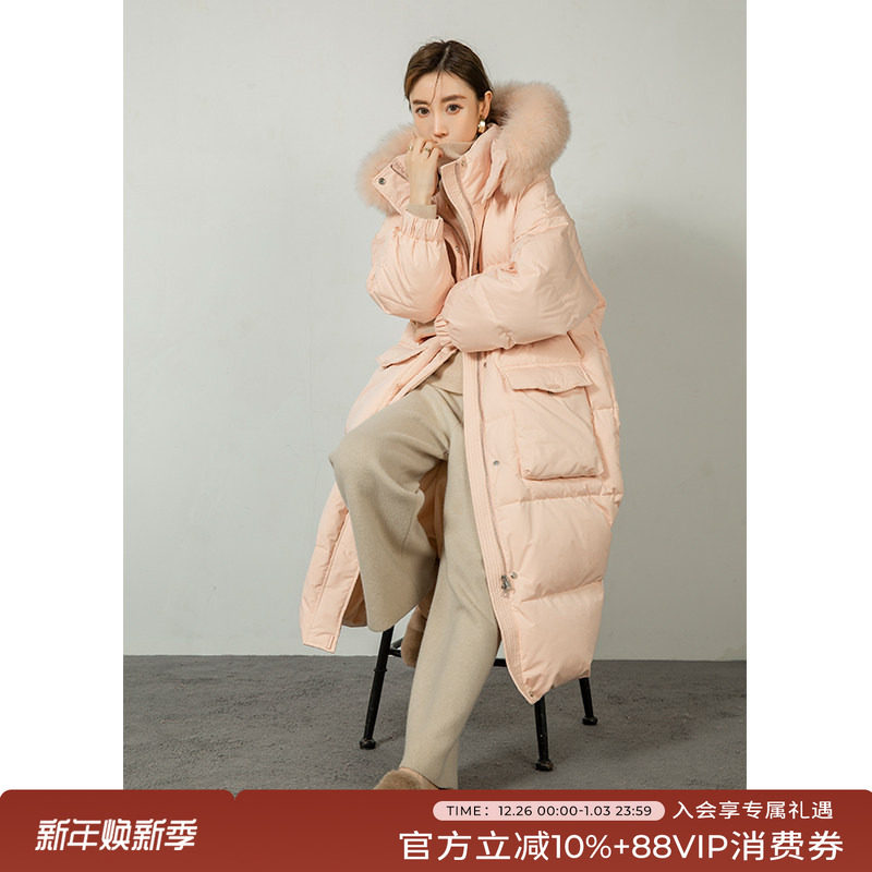 竹依依粉色狐狸大毛领羽绒服女冬季长款加厚保暖连帽90白鸭绒外套