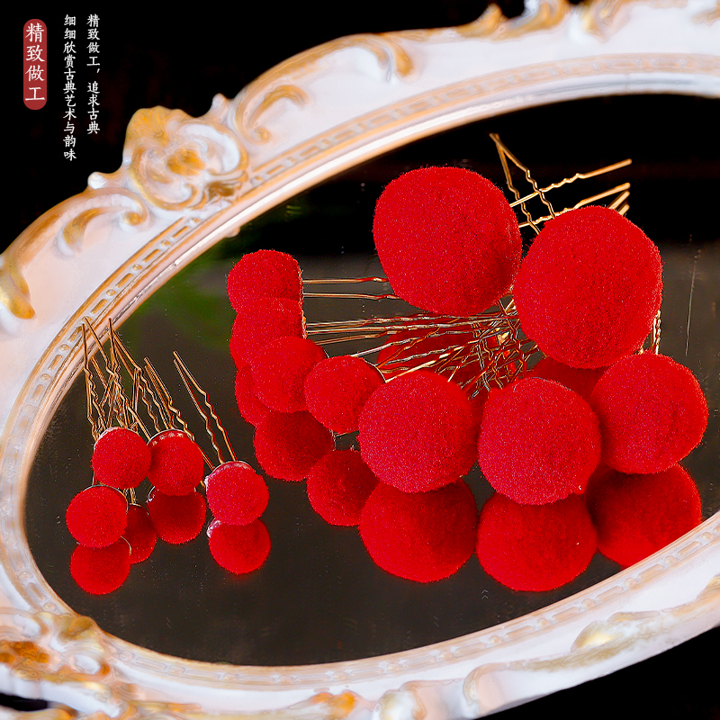 古风新年百搭红色财女可爱头饰毛球U钗盘发点缀发钗古装配饰发簪