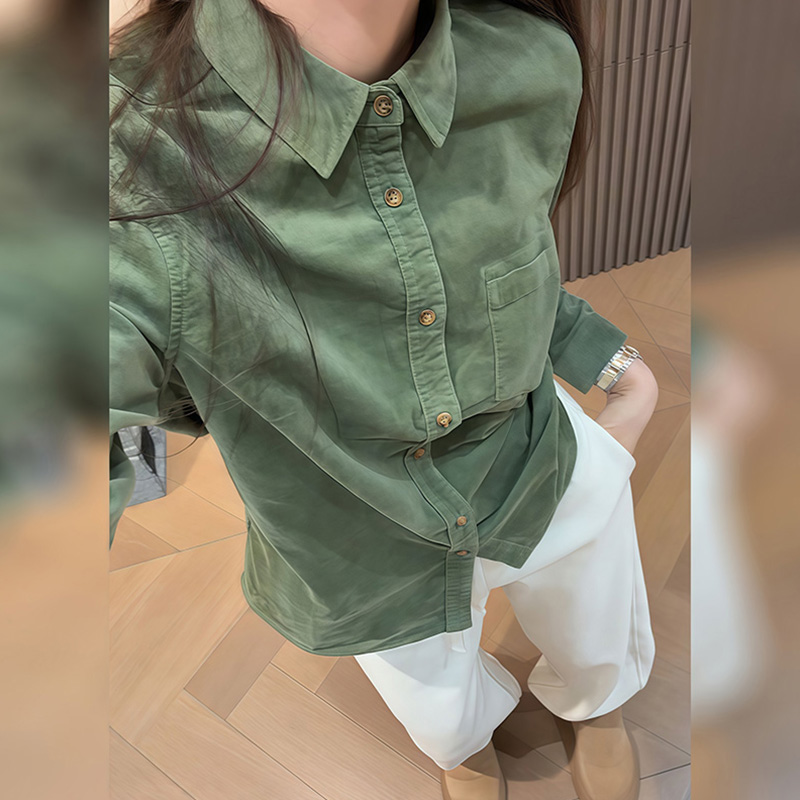 复古风绿色长袖衬衫女秋冬季新款宽松POLO领通勤显白气质纯色上衣