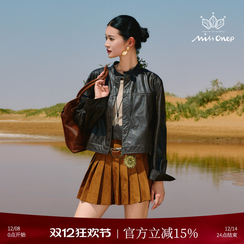Missonep逸【咖韵染】复古风短款皮衣外套配针织内搭两件套女秋季