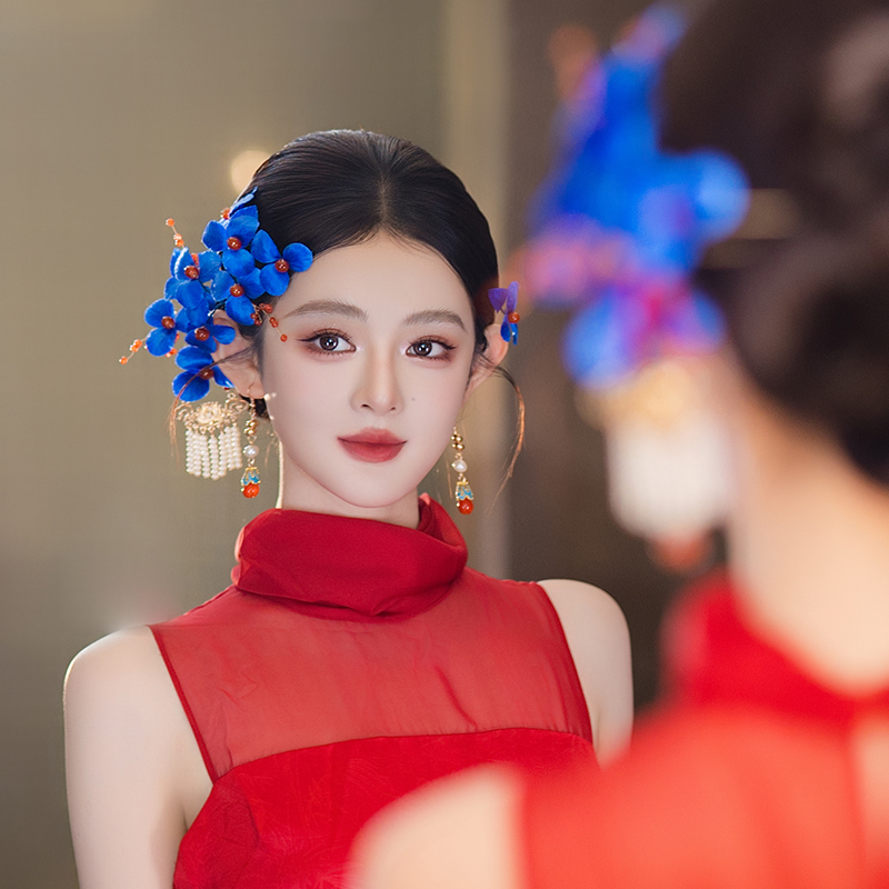 新娘国风高级感小众手工复古蓝色绒花发簪古风汉服结婚新中式发饰