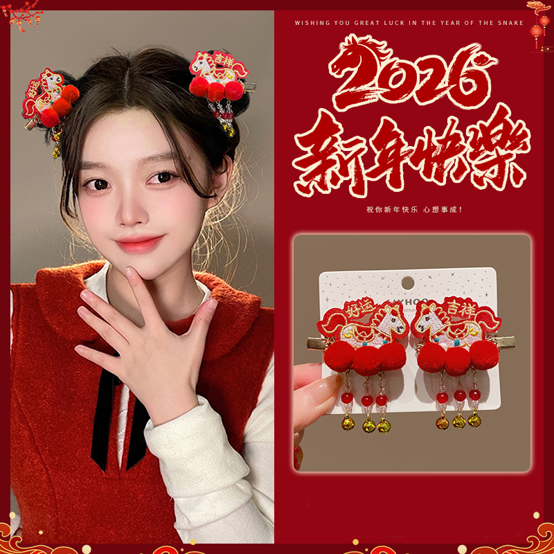 女童新年红色发夹2026新款过年头饰儿童古风流苏假发发卡女孩夹子