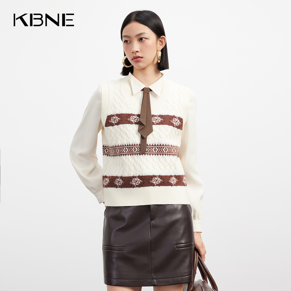 KBNE休闲风马夹2026年春季新款复古风翻领针织背心几何图案女上衣