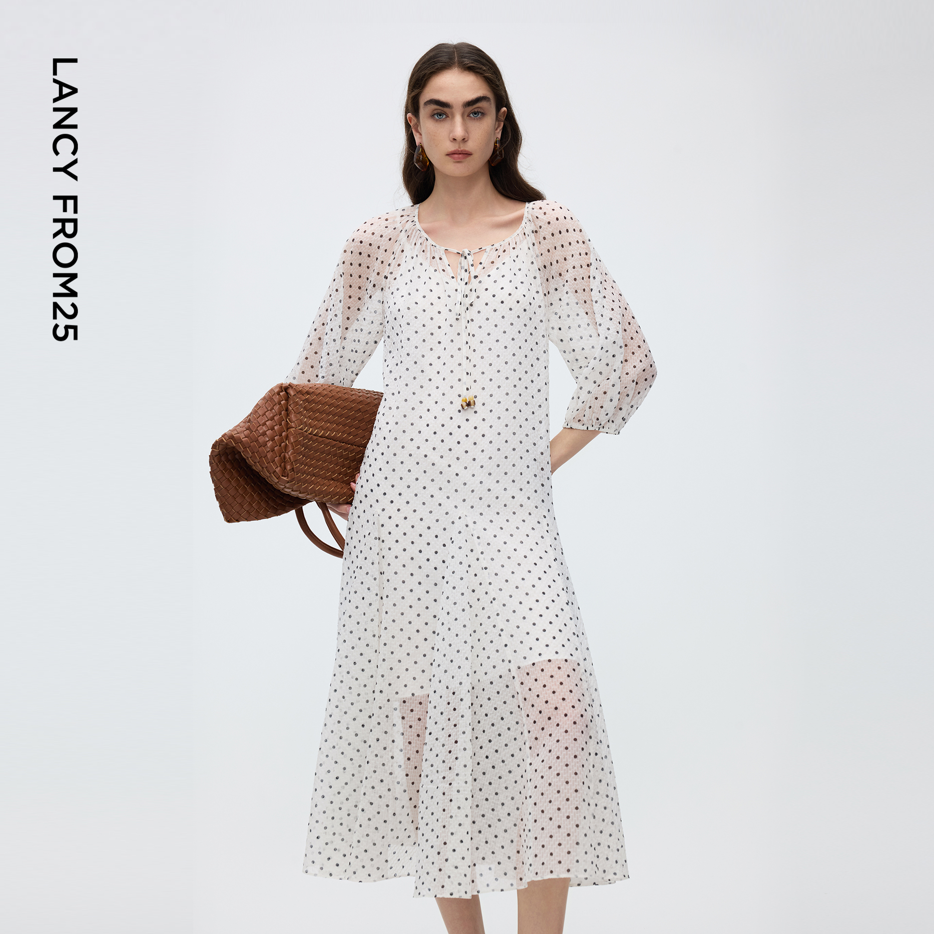 朗姿波点v领大摆连衣裙复古风高级感气质时尚长裙2025年秋季新款